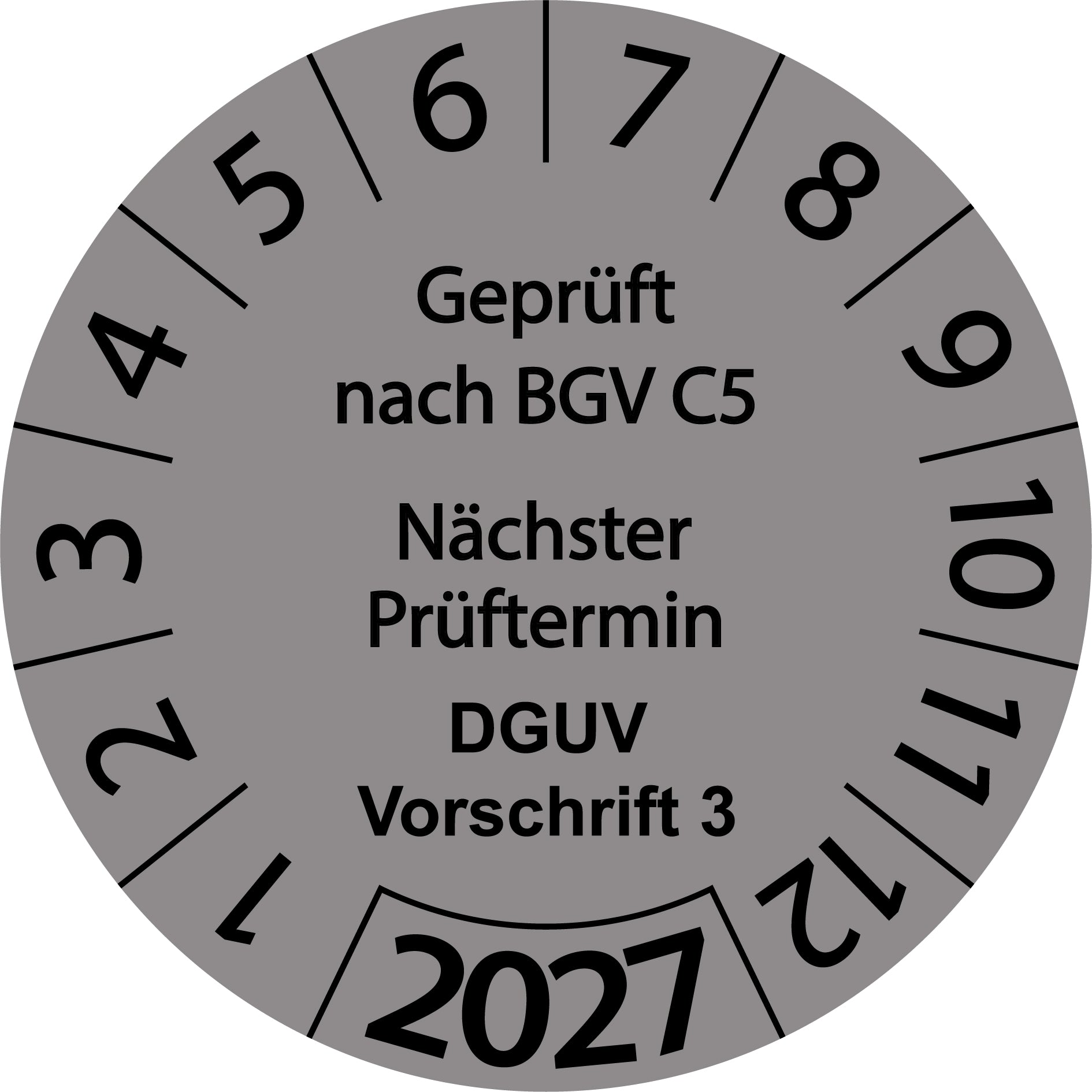 Einjahresprüfetiketten, Geprüft nach BGV C5, Nächster Prüftermin, DGUV Vorschrift 3, Startjahr: 2027 aus Papier oder Plastik