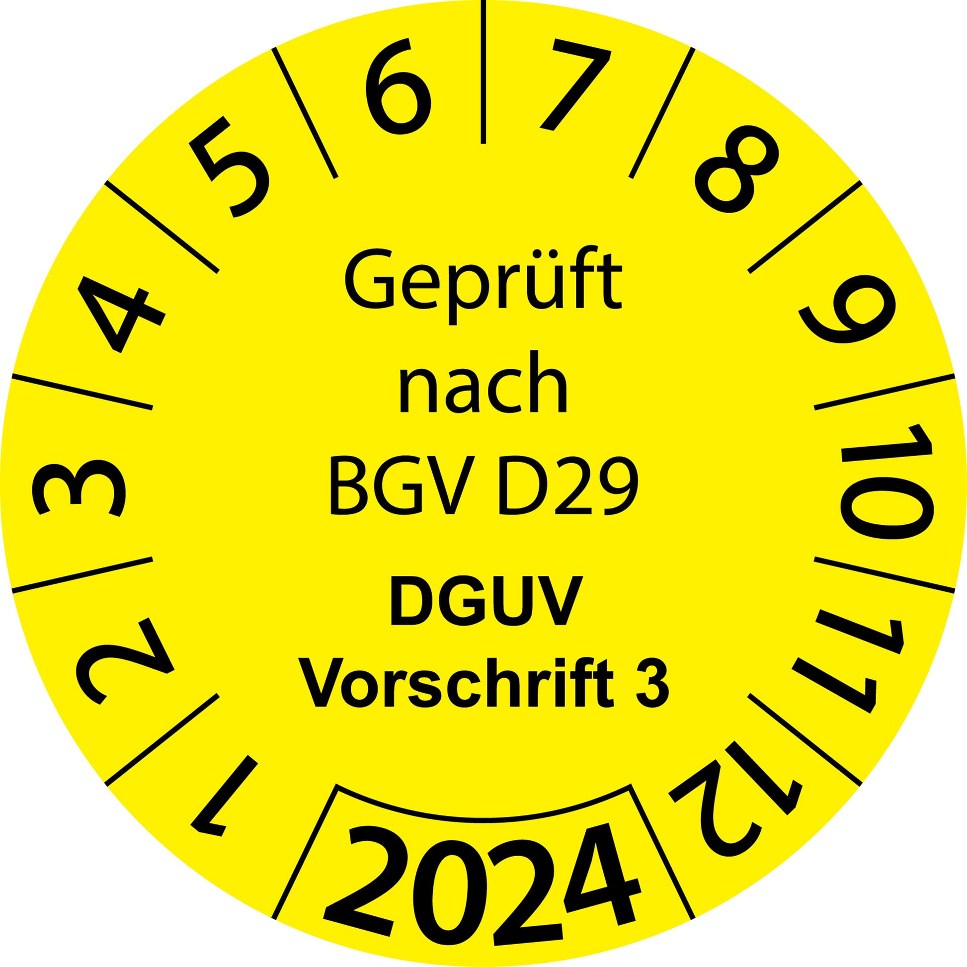 Einjahresprüfetiketten, Geprüft nach BGV D29, DGUV Vorschrift 3, Startjahr: 2024