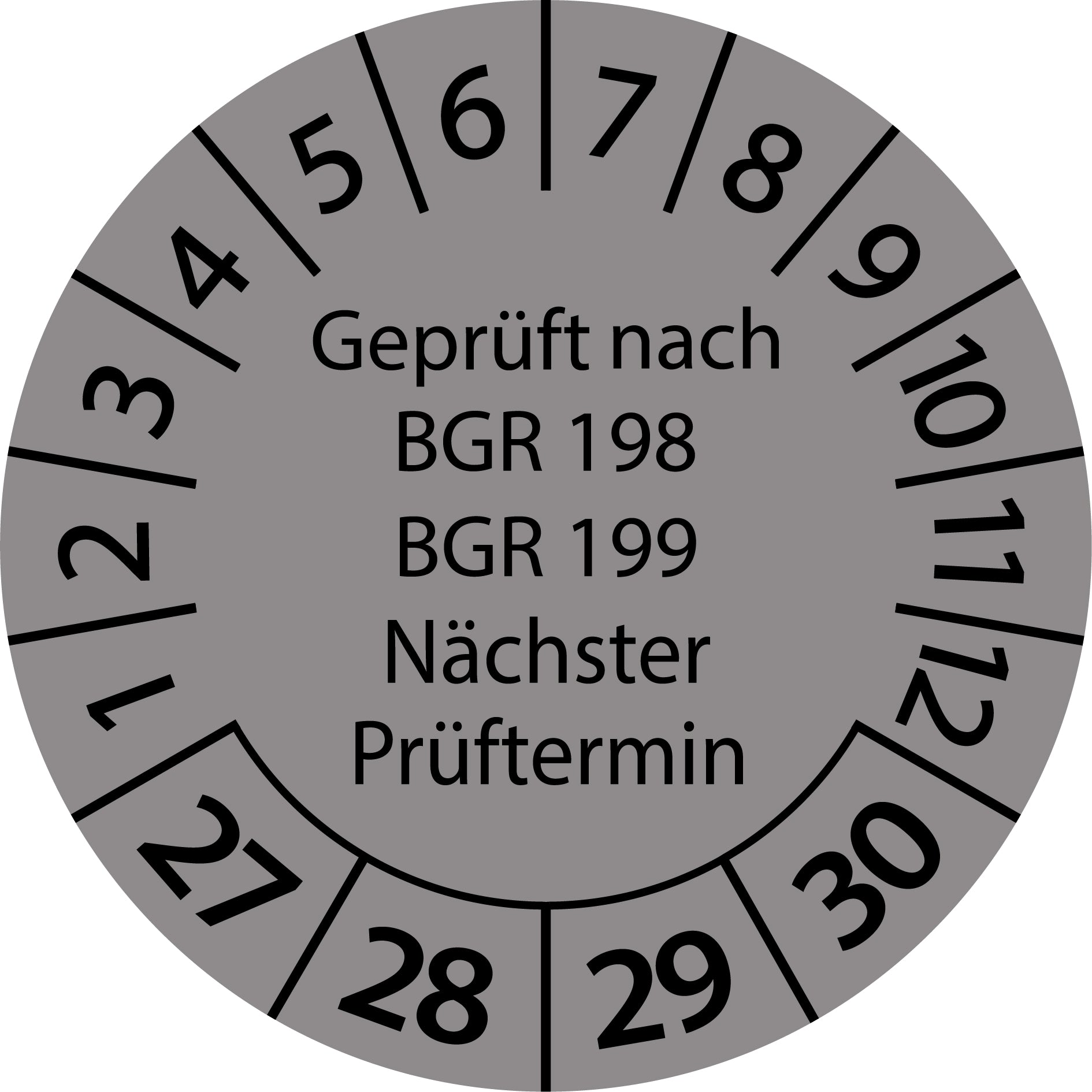 Mehrjahresprüfetiketten, Geprüft nach BGR 198 + 199, Nächster Prüftermin, Startjahr: 2027