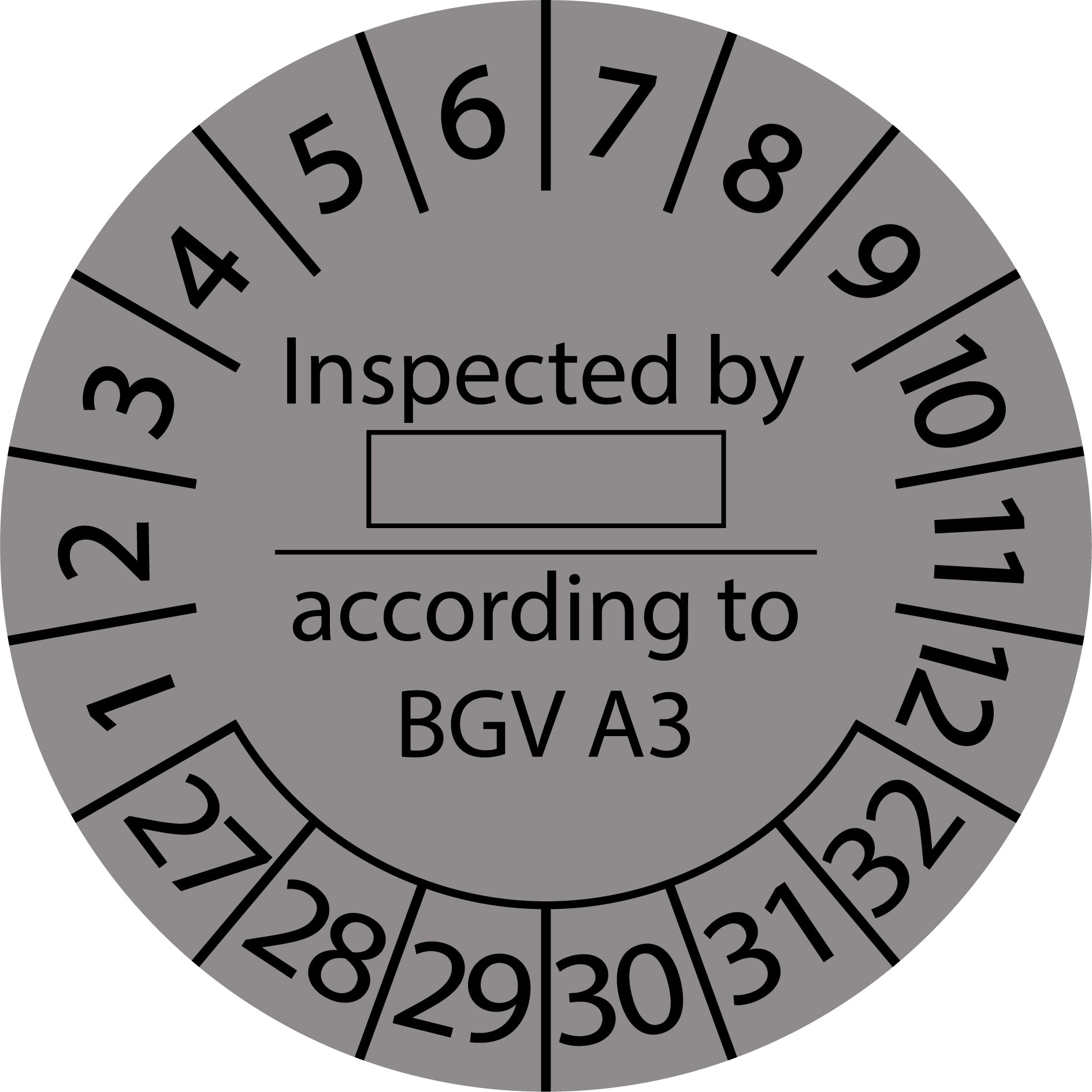 Mehrjahresprüfetiketten, Inspected by ..., according to BGV A3, Startjahr: 2027
